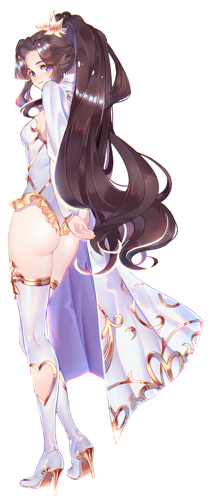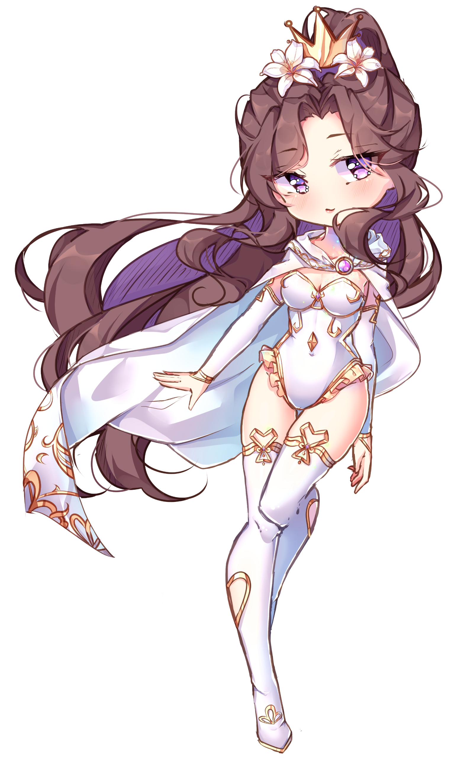 Vera is a tall, slender young woman standing at 5 foot 7 inches. With her shoes, she stands at 5 feet, 10 inches tall. She has rosy skin and always has a bright smile.Vera has purple eyes and black hair that catches light. She keeps her hair pulled up in a half-up, half-down ponytail. In her hair, she wears one (or more) of Ren's lilies.She wears a white and gold leotard, thigh-high tights, heels, and a cape. Her cape is imbued with magical properties that keeps her warm. She hates the cold.