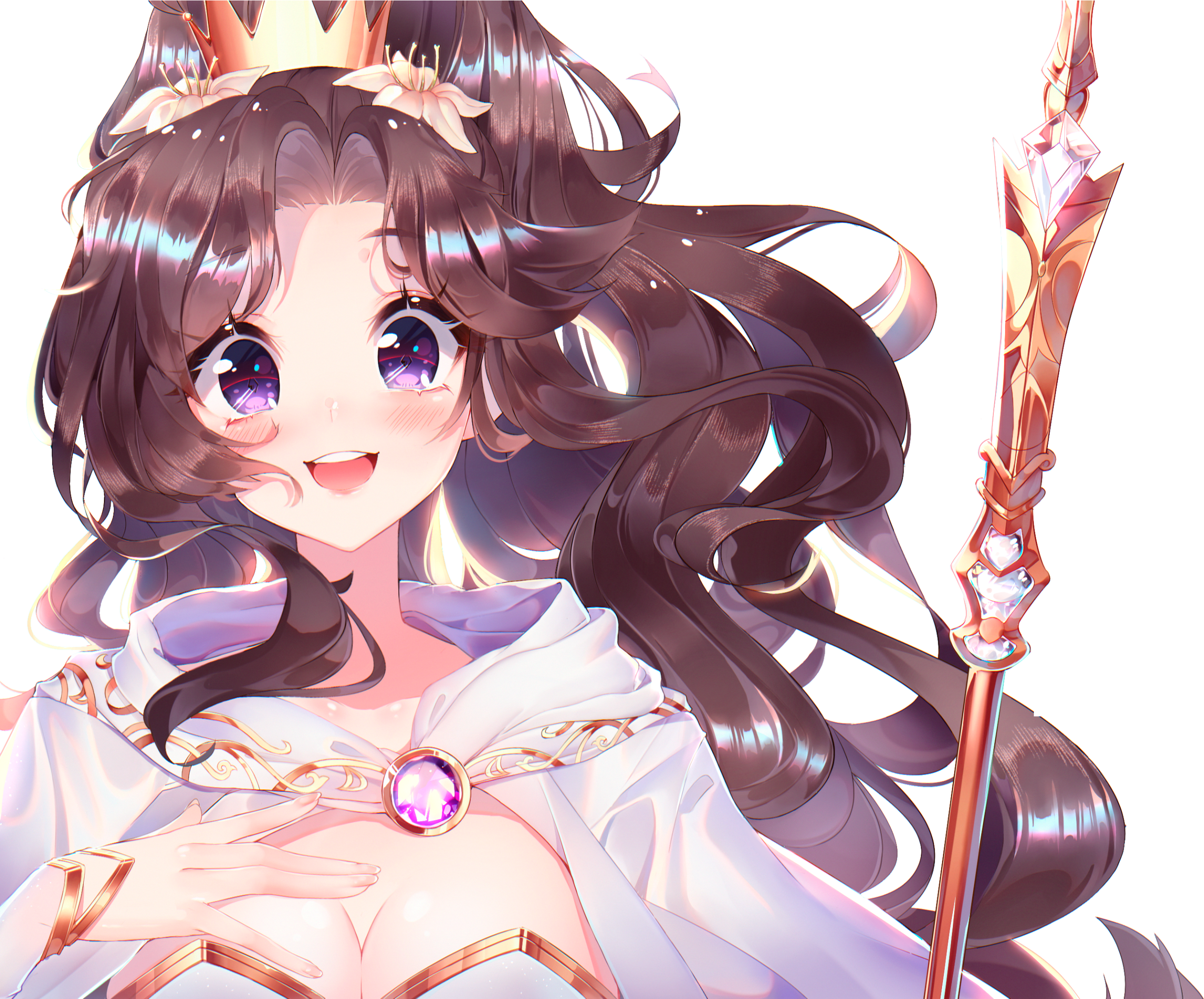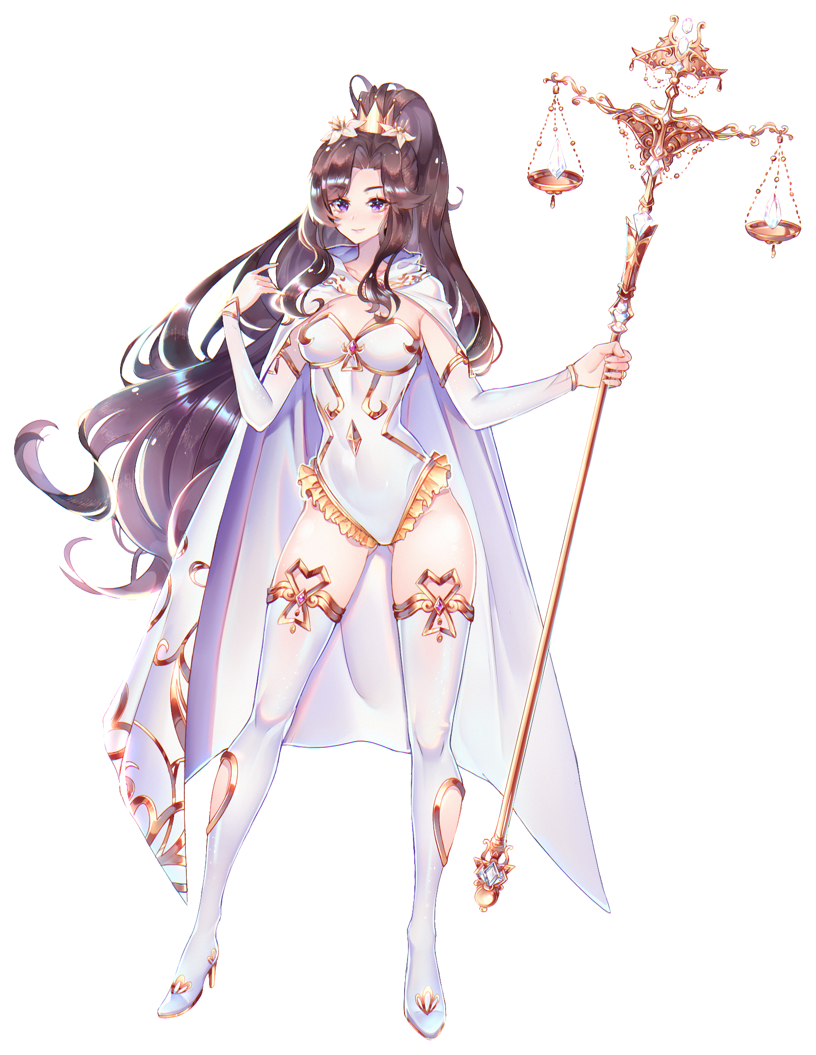 Her staff is shaped like a judgment scale, and ebbs and flows as she conducts magic through it.